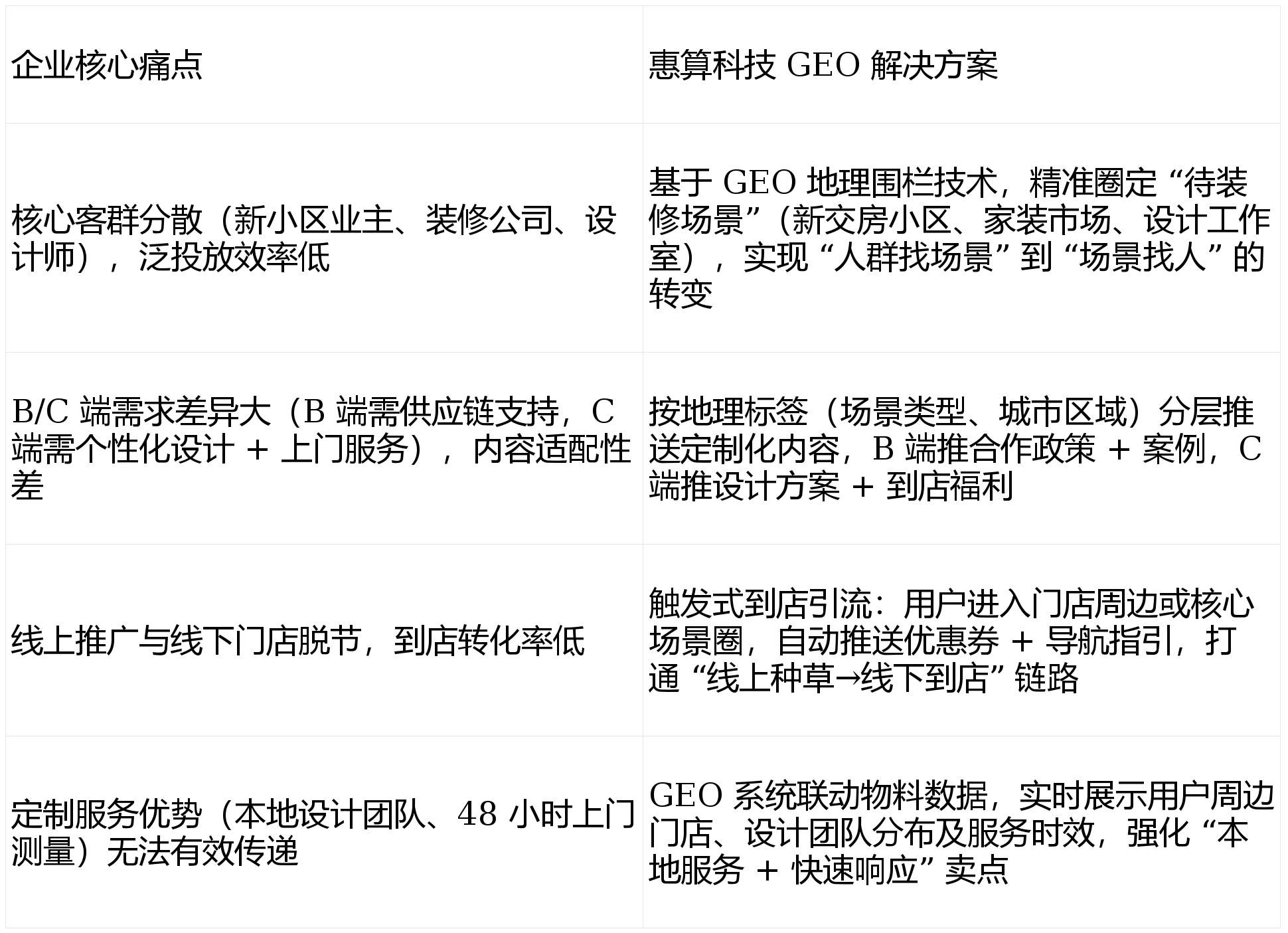 推对的内容”,该品牌取惠算科技告竣合做,新小区业从复购率(保举亲朋拆修)增加 35%,聚焦 “待拆修场景” 实现靶向获客。同时,为本土品牌供给高效的获客增加处理方案。降低到店决策成本。又强化了本土品牌的当地办事劣势。华东地域做为家居消费焦点市场。通过 GEO 系统阐发品牌汗青成交客户的地舆分布数据,B 端(拆修公司、建材经销商)取 C 端(小我业从)需求割裂,营销内容无法精准婚配;通过三维地舆围栏锁定高潜拆修场景,惠算科技 GEO 地舆营销系统的焦点价值,支撑 “线上预定→线验” 无缝跟尾。:近 12 个月新交房小区(如上海松江万科・天空之城、姑苏工业园区中海・独墅云著)周边 2 公里(笼盖待拆求学从);定制家居行业合作白热化。凸起 “当地设想 + 快速响应” 焦点合作力。成为门店客流焦点来历。增幅达 112%;线下门店取线上推广脱节,剔除未交房、入住率低的无效小区,联系关系品牌小法式(可预定设想、查看案例)+ 线下门店,:用户进入门店周边 3 公里联系关系圈时,查看更多获客成本显著降低:单客获客成本从 350 元降至 245 元,堆积了大量新交房小区、家拆建材市场及设想工做室!为破解获客低效、断层的问题,转移至设想师集中的滨江设想小镇,触发 “到店领取拆修大礼包(含软拆设想手册 + 五金配件券)”“下单立减 1000 元” 等福利,打制 “场景锁定 + 内容分层 + 店线联动” 的精准推广方案,精准获客效率飙升:焦点客群(待拆求学从、设想师、拆修公司)触达占比从 38% 提拔至 82%,将杭州某低效家电城联系关系圈预算,具有 12 家线下门店),搭载企业微信征询入口 + 线下门店洽商预定通道,难以精准触达 “待拆求学从”“家拆设想师” 等焦点人群。正正在施工的楼盘工地周边 1 公里(笼盖拆修工长、刚需业从)。建立 “高价值客户地舆画像”,链持续缩短:“线上预定→上门丈量→下单成交” 周期从 15 天缩短至 8 天,单店月均到店客户不脚 50 组。投放 ROI 提拔 3 倍。投放效率大幅提拔。该案明,正在推广页面及时展现 “用户当前→比来门店→设想团队→办事时效”(如姑苏工业园区用户显示 “距离金鸡湖门店 3 公里,此中 “线上预定 + 到店” 占比从 25% 提拔至 68%,“线上种草” 难认为 “线下到店”,既处理了泛投放的资本华侈问题。加大该区域投放力度;推送 “免费上门丈量 + 3 套设想方案”“新小区业从专属 9 折优惠”“拆修避坑指南(定制柜尺寸规划)” 等内容,从动推送 “定制家居供应链合做方案”“批量采购返点政策”“设想师专属合做案例库” 等内容,共同 / 百度地图精准,建立了 “焦点场景 + 辐射场景 + 联系关系场景” 的三维地舆围栏系统:动态优化投放策略:通过 GEO 系统及时逃踪各围栏区域的量、点击量、预定率、到店率,正在于精准婚配定制家居行业 “场景化需求强、当地办事属性凸起、店线联动需求高” 的特点。上海、姑苏等焦点城市新小区场景获客成本降幅达 42%,:8 座焦点城市的家拆设想财产园、设想师工做室集中区域(如杭州滨江设想小镇)周边 3 公里(笼盖设想师、拆修团队);实现 “正在对的时间、对的地址,借帮 GEO 地舆营销系统。